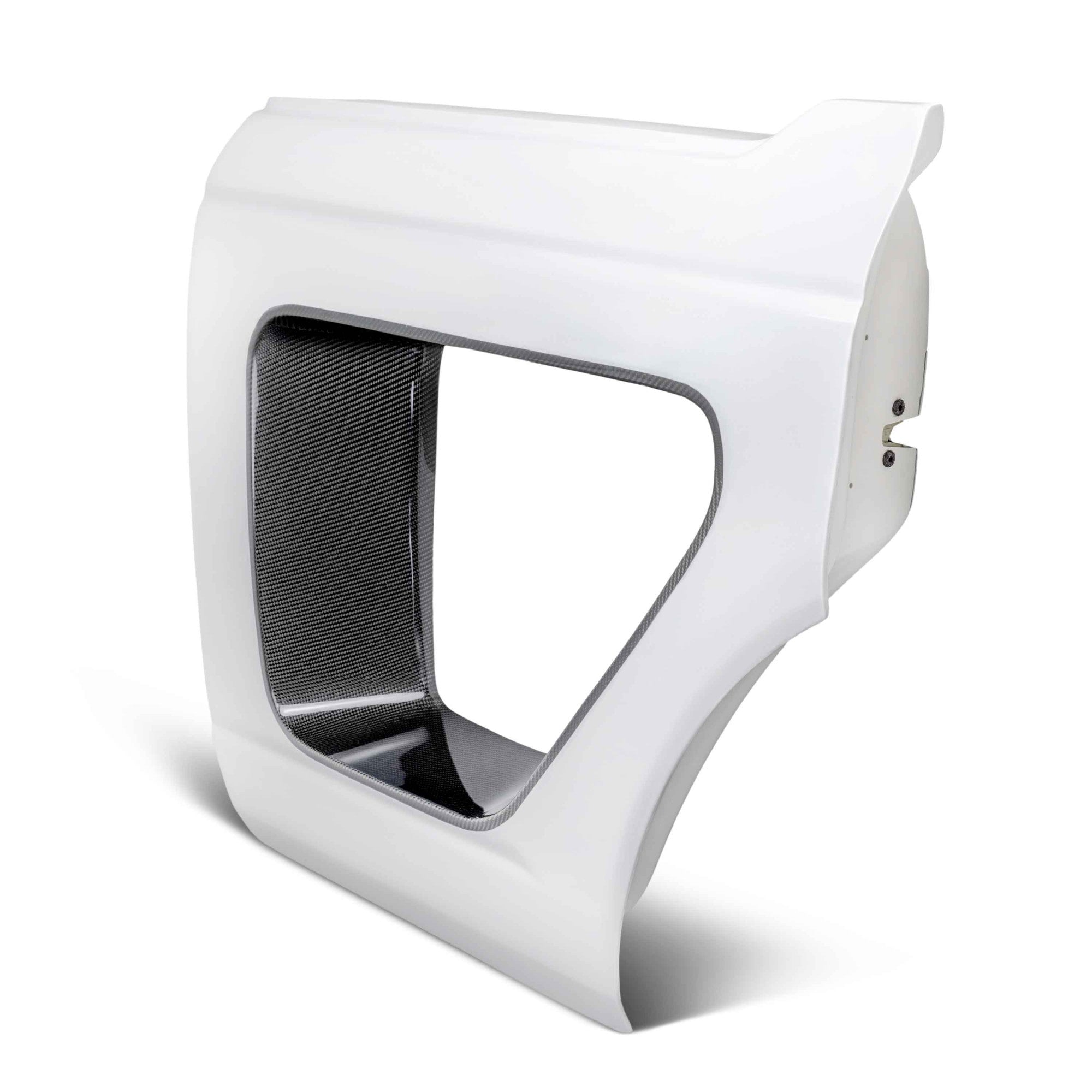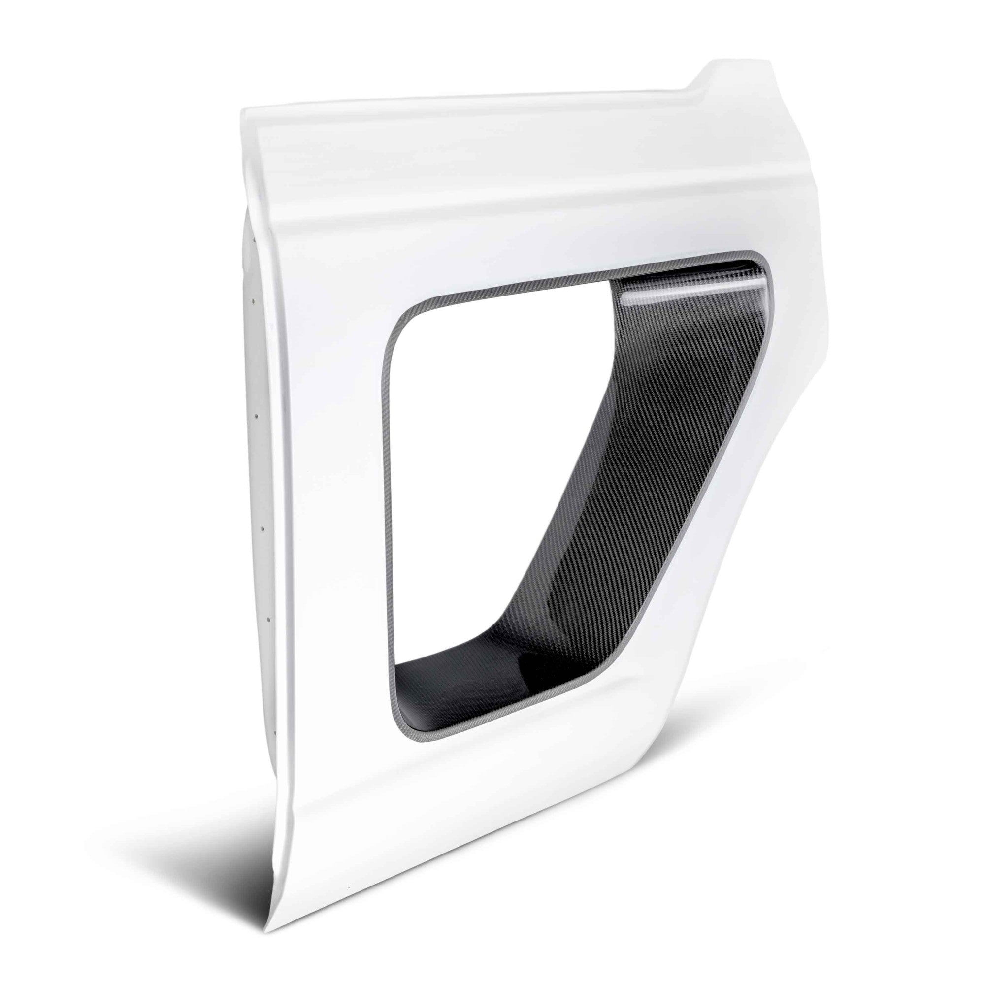 Constructed using a vacuum-infused process with fiberglass cloth, these doors feature durable white gel coat finishes combined with sleek 3K, 2x2 carbon fiber twill inserts. Their innovative halo design improves visibility and adds a modern, aggressive aesthetic to your vehicle.